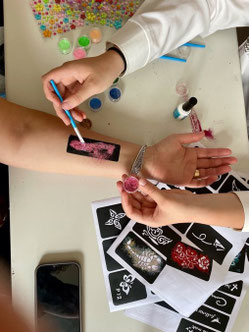 Am Morgen haben wir begonnen, die Tische zu putzen und als Buffet und Sitzbereich aufzustellen. Als wir fertig waren, haben die 6-8.-Klässler die Stationen aufgebaut. Im Klassenzimmer der Klasse 6-8 gab es eine Tatoo-Station und einen Schminktisch für Kinder. Es gab sehr viele verschiedene Glitzerarten und auch verschiedene Formen und Muster für die Tatoos. Meine Unterstützung waren Seda, Malak , Jessica, Albesa.