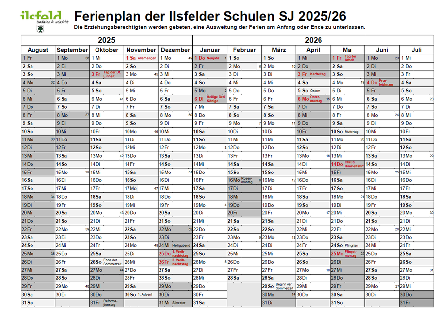 Ferienplan der Ilsfelder Schulen SJ 25/26